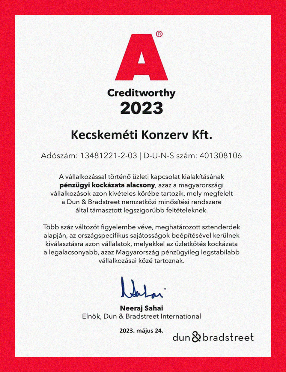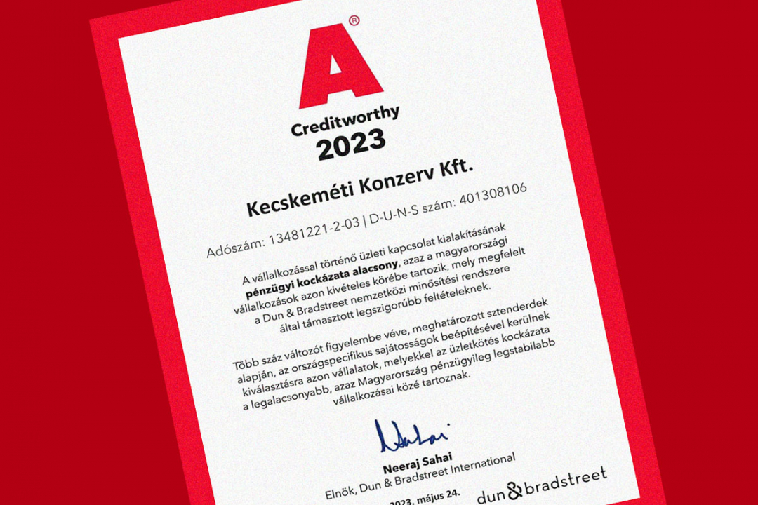 A Dun & Bradstreet International amerikai üzleti adatbázis-szolgáltató cég felmérése alapján a Kecskeméti Konzerv Kft. Magyarország pénzügyileg legstabilabb vállalkozásai közé tartozik.